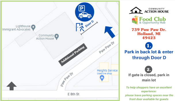 Please park in our back parking lot and enter through Volunteer entrance, Door D. See map below.
