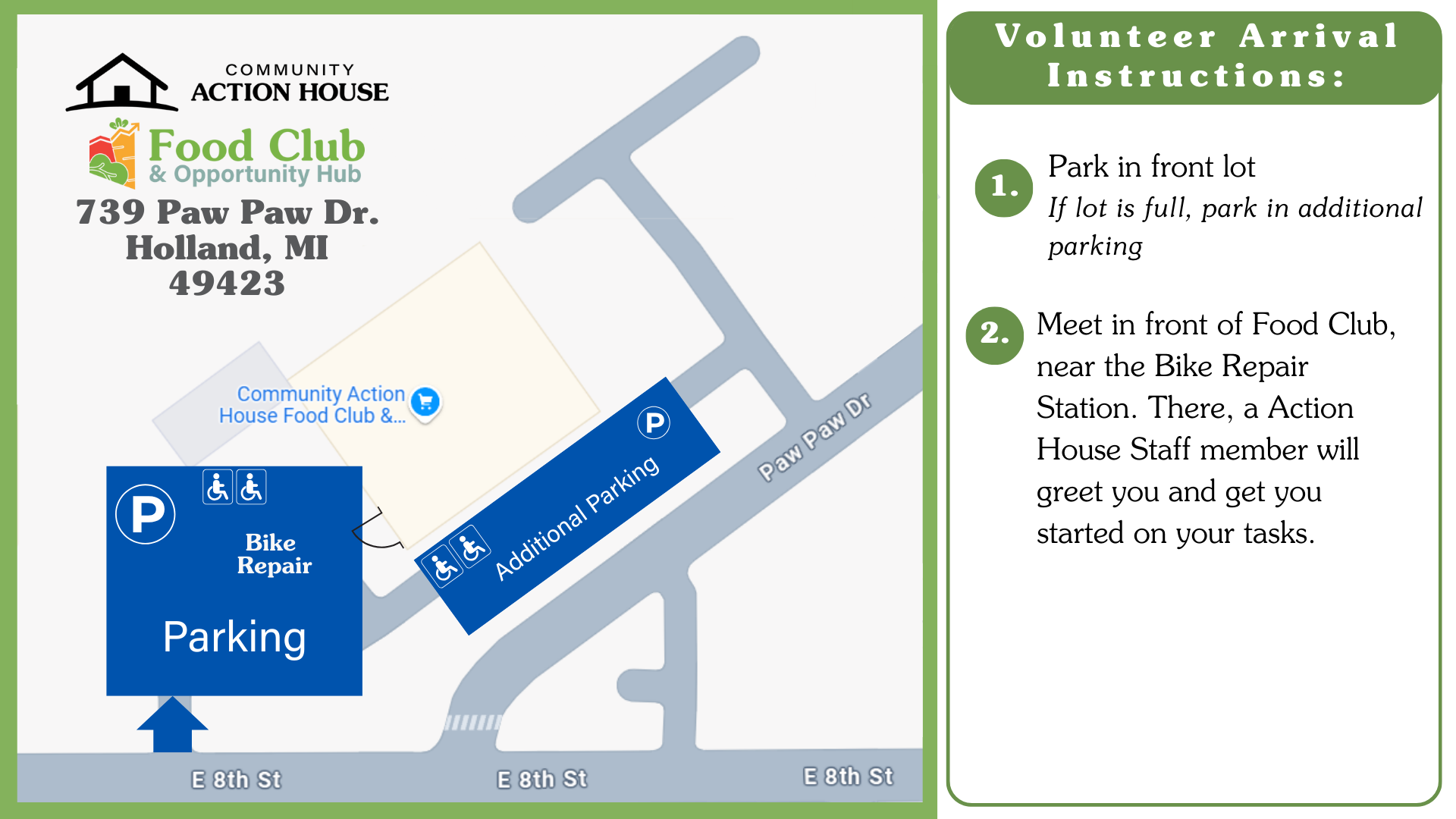 Please park in the front lot or angled parking spots facing Paw Paw Drive. Plan to meet in front of Food Club near the Bike repair station. A staff member will meet you there to get you started! See map below.