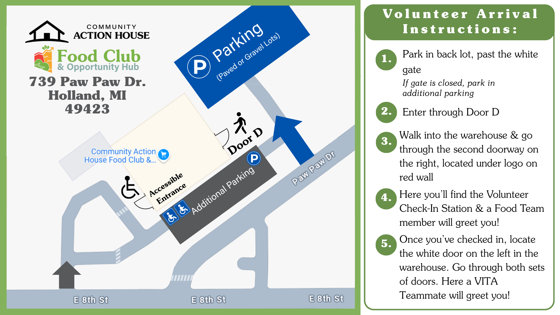 Please park in our back parking lot and enter through Volunteer entrance, Door D. See map below.