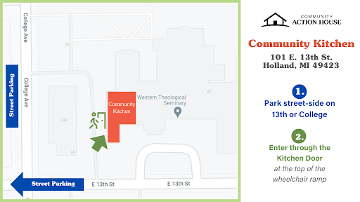Parking is available street-side on E 13th Street and College Avenue, and our Kitchen Entrance is on the Southwest side of the building. See map below.