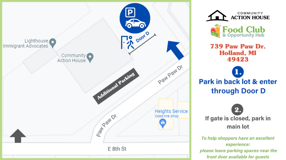 Parking is available in our back lot, and volunteers will enter through the entrance next to the garage door. Our team will meet you there and get you started for your shift!